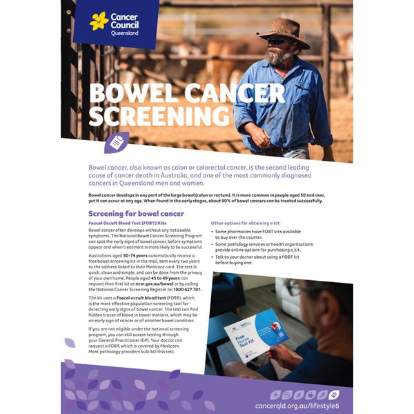 The Bowel Cancer Screening Factsheet empowers people aged 45-74 to take control of their health by understanding how bowel cancer screening works, how to participate in the program, and what the risk factors and symptoms of bowel cancer are. Designed for anyone to use, this factsheet is suitable for clinics, health and community centers, and workplaces.