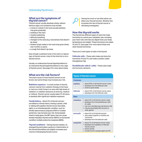 Many people feel shocked and upset when told they have thyroid cancer. We hope this factsheet will help you, your family and friends understand how thyroid cancer is diagnosed and treated.